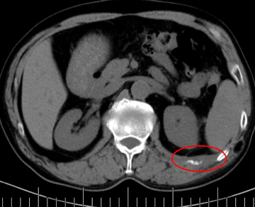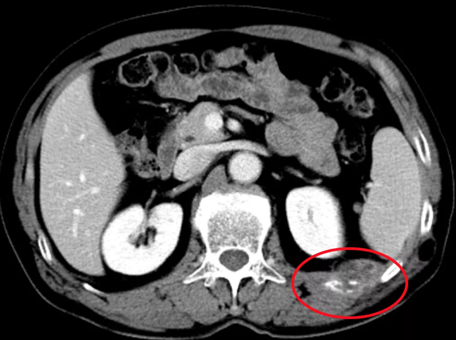 造影顯示紅圈內(nèi)“烏云”區(qū)域?yàn)槟[瘤。