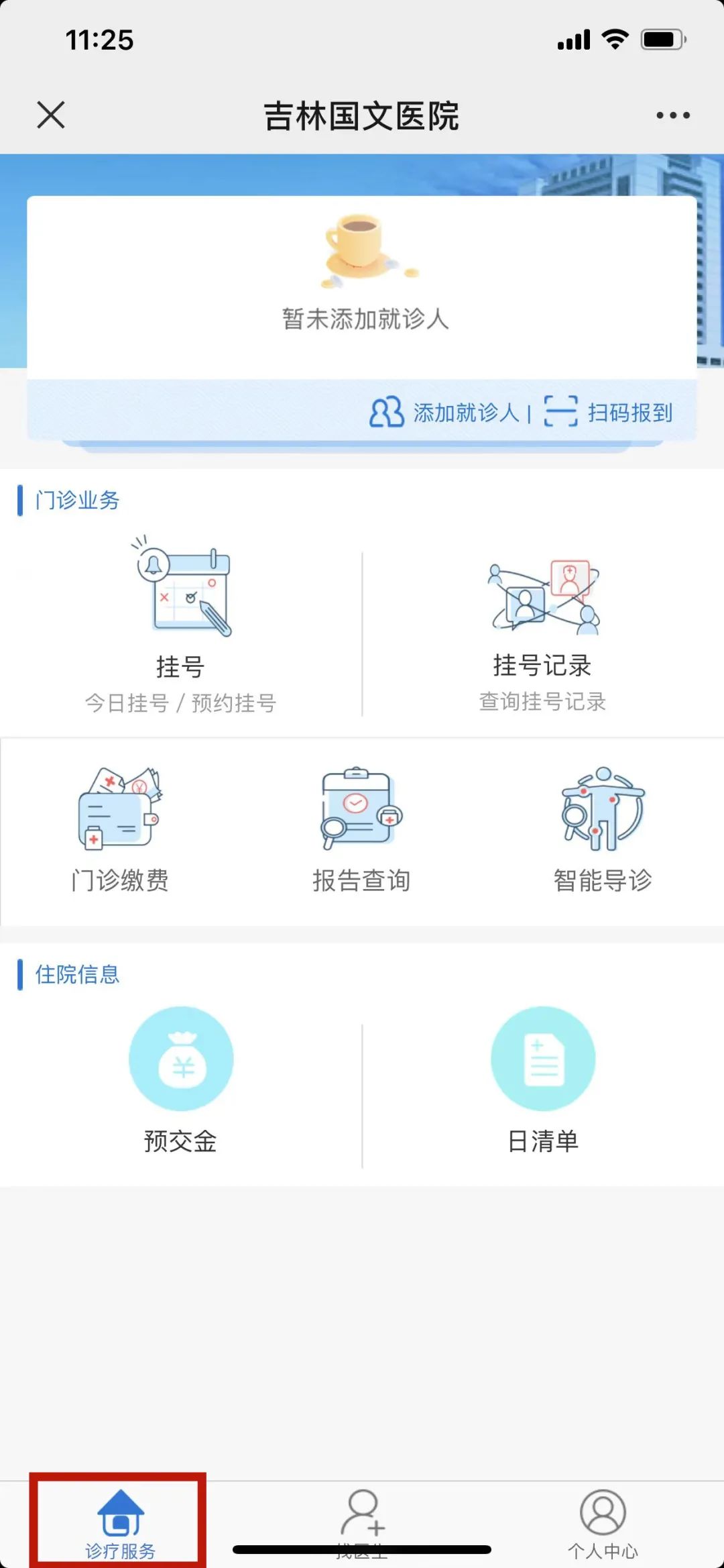點(diǎn)擊服務(wù)號界面【微服務(wù)】中的【掛號繳費(fèi)】,進(jìn)入后選擇【診療服務(wù)】,進(jìn)入功能菜單界面。