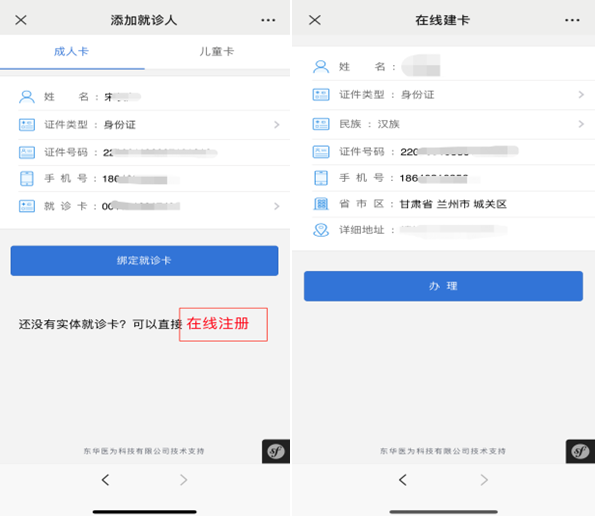若患者之前沒有在醫(yī)院就診過,則在【添加就診人】界面點(diǎn)擊下方【在線注冊】,輸入姓名、民族、證件號碼(身份證)、手機(jī)號、詳細(xì)地址,點(diǎn)擊辦理生成就診卡。