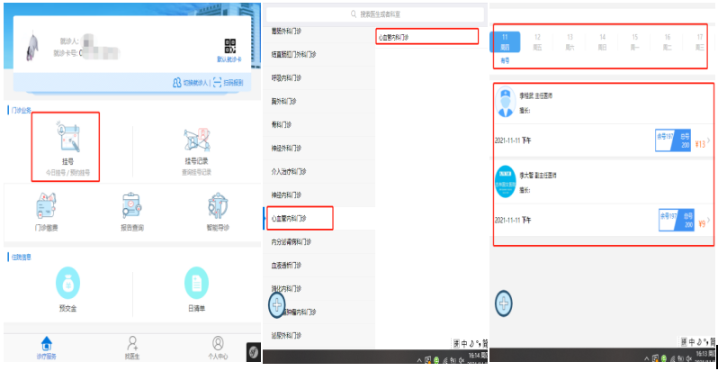 點(diǎn)擊功能菜單界面【掛號】選項,進(jìn)入到掛號界面,閱讀【掛號預(yù)約須知】并選擇【同意】,進(jìn)入掛號界面后【選擇科室】→【進(jìn)入科室】→【選擇醫(yī)生】→【支付掛號費(fèi)用】,如需預(yù)約掛號,請選擇需要預(yù)約的日期。