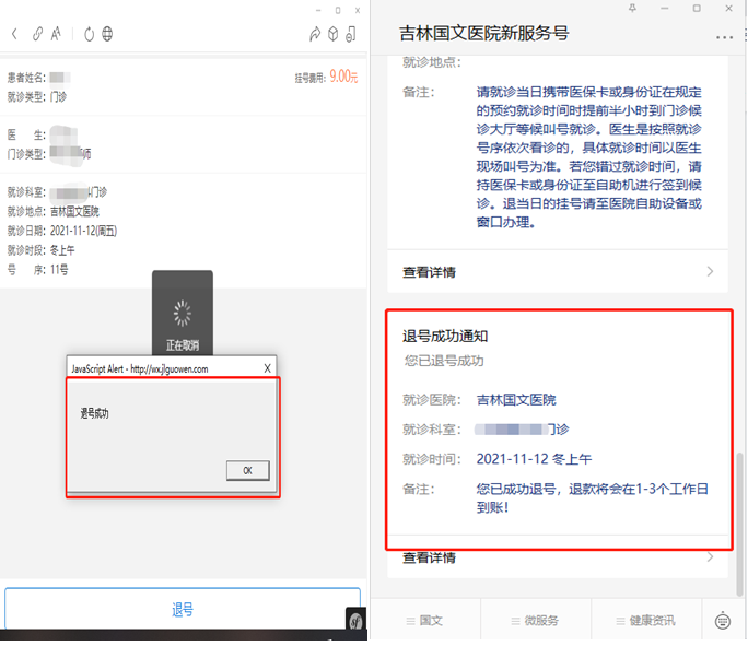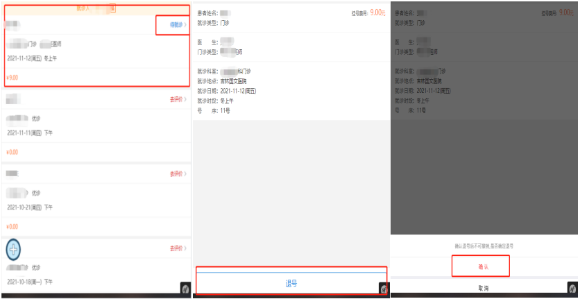 若更改就診計劃,需要取消掛號,點(diǎn)擊功能界面【掛號記錄】,進(jìn)入記錄界面后在已掛號項中點(diǎn)擊【待就診】,進(jìn)入界面后點(diǎn)擊【退號】,確認(rèn)無誤后點(diǎn)擊【確定】,會出現(xiàn)【退號成功】彈窗,掛號費(fèi)自動返回支付路徑(微信)。