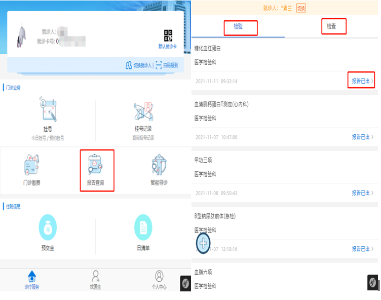 打開功能菜單界面,點(diǎn)擊【報告查詢】,進(jìn)入查詢界面后,可以選擇查詢【檢驗】或【檢查】已出的報告,點(diǎn)擊【報告已出】即可查看檢驗或檢查項目的詳細(xì)報告(僅供參考,以紙質(zhì)報告為準(zhǔn)。)
