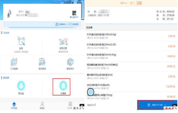 點(diǎn)擊功能菜單界面中的【日清單】,進(jìn)入后可以查詢所有費(fèi)用明細(xì),包括【預(yù)交款】【費(fèi)用】【余額】,也可以按照日期去選擇查看某一天的費(fèi)用(點(diǎn)擊右下角日期選擇)。