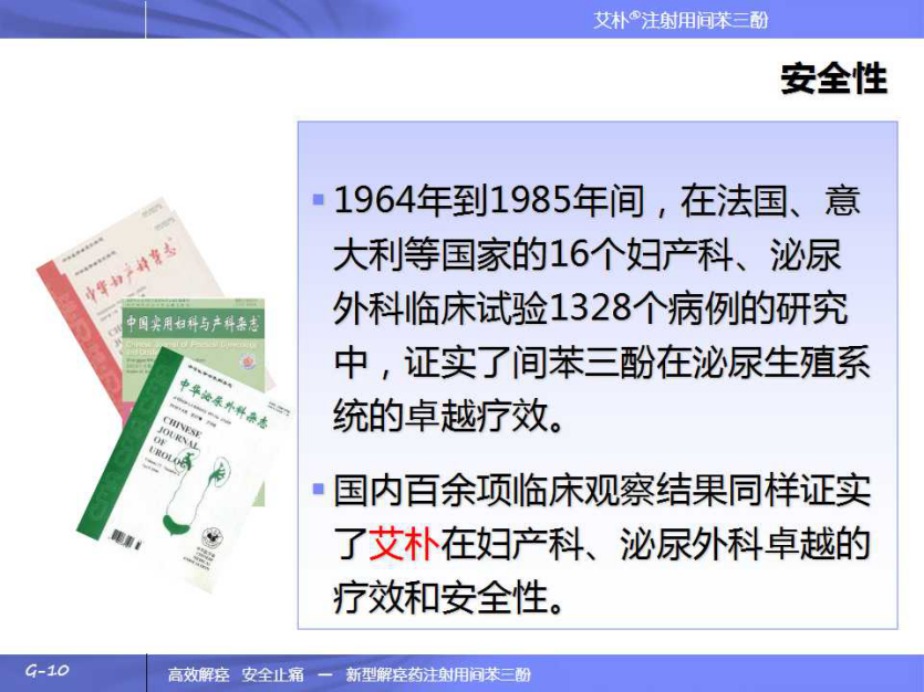1964年到1985年間,在法國(guó)、意大利等國(guó)家的16個(gè)婦產(chǎn)科、泌尿外科臨床試驗(yàn)1328個(gè)病例的研究中,證實(shí)了間苯三酚在泌尿生殖系統(tǒng)的卓越療效。 國(guó)內(nèi)百余項(xiàng)臨床觀察結(jié)果同樣證實(shí)了艾樸在婦產(chǎn)科、泌尿外科卓越的療效和安全性。
