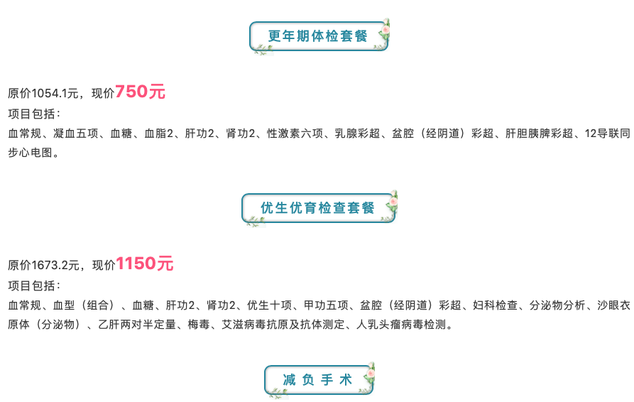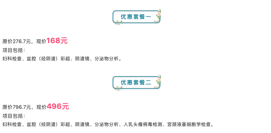 門診檢查優(yōu)惠項(xiàng)目:婦科內(nèi)診、陰道分泌物分析、宮頸癌前篩查(宮頸液基細(xì)胞學(xué)檢查、宮頸人乳頭瘤病毒檢測(cè))、盆腔(經(jīng)陰道)三維彩超、進(jìn)口電光一體電子陰道鏡等。針對(duì)不同個(gè)體差異進(jìn)行不同套餐選擇。