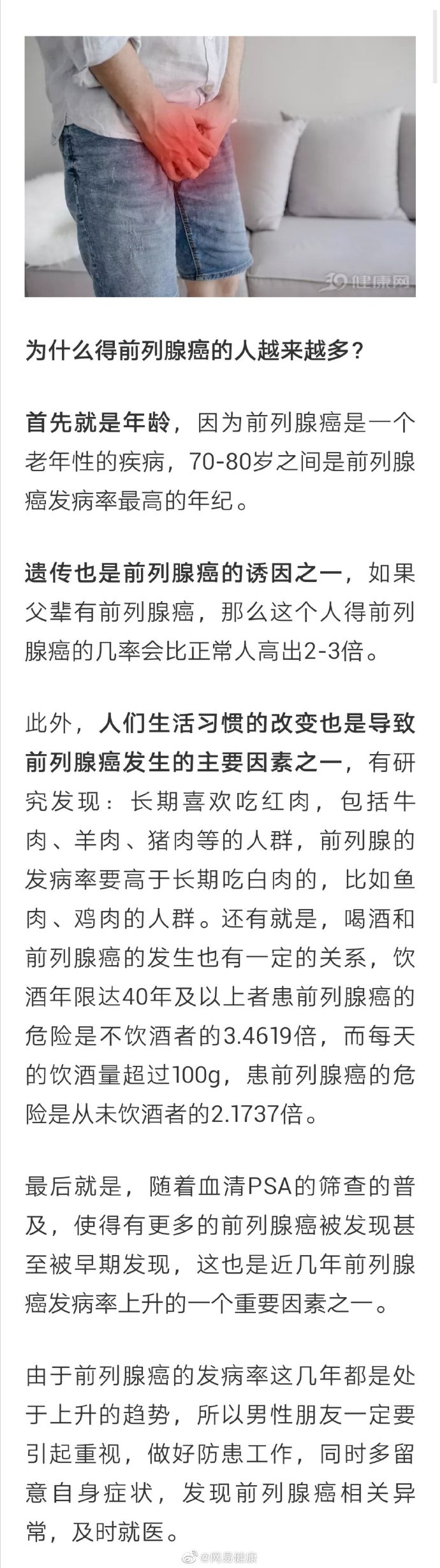 列腺癌嚴重危害男性身體健康,所以平時要注意做好防患,適當了解相關癥狀,以便于發(fā)現(xiàn)問題,可以及時就醫(yī)。那么,為什么得前列腺癌的人越來越多?前列腺癌早期有哪些癥狀?哪些人需要篩查前列腺癌?(來源:腫瘤的真相與誤區(qū))