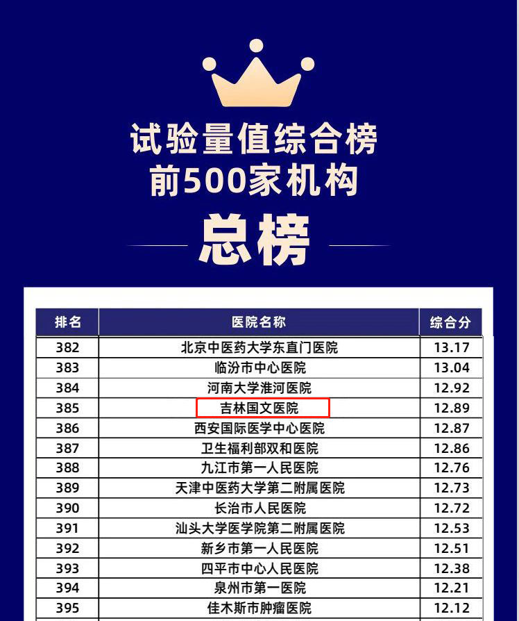 日前,2023年度《全國(guó)GCP機(jī)構(gòu)藥物臨床試驗(yàn)量值排行榜》盛大發(fā)布。在反映醫(yī)院藥物臨床試驗(yàn)整體水平的榜單中,吉林國(guó)文醫(yī)院位列全國(guó)腫瘤醫(yī)院試驗(yàn)量值排行榜第39位,省內(nèi)第2位。位列全國(guó)試驗(yàn)量值綜合榜排名385位,吉林省排名第10位。