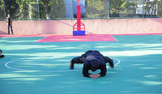 當(dāng)聽到蹲下的口令時(shí),隊(duì)員們整齊右腳整齊撤步,兩腳分開約60度,上體保持正直,雙手放在膝蓋上。當(dāng)聽到起立的口令時(shí),迅速起立,收腳,成立正姿勢(shì)。