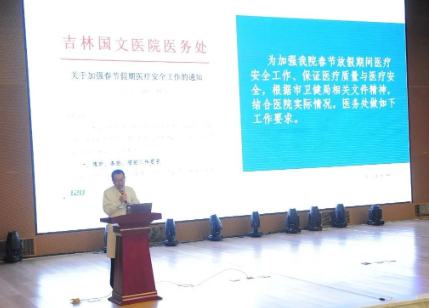 醫(yī)務(wù)處劉寶安處長要求全院各臨床科室做好春節(jié)期間的醫(yī)療安全工作和值班工作,要求全院臨床科室要合理配備值班人員,嚴(yán)格落實各項醫(yī)療管理制度,加強(qiáng)備班力量,全力保障春節(jié)期間的醫(yī)療安全,確保患者的健康和生命安全不受影響。