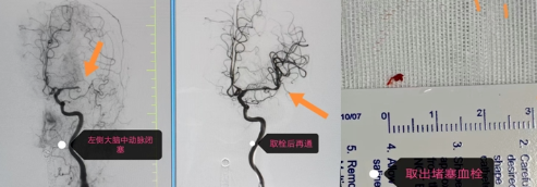 在神經介入團隊丁金明主任、朱洪波副主任共同努力下,通過交換技術成功超遠目標血管,釋放取栓支架,通過取栓支架取出一團塊狀血栓,成功開通左側大腦中動脈血流,挽救了患者的生命,術后頭CT檢查未見出血,轉入重癥監(jiān)護病房進一步治療。