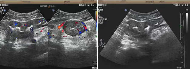 轉(zhuǎn)診至我院后,腸鏡檢查有了重要發(fā)現(xiàn) —— 王女士腸道內(nèi)存在不規(guī)則腫物,腫物表面出現(xiàn)潰爛出血的情況,還導(dǎo)致了腸腔狹窄。這一發(fā)現(xiàn)讓病情的排查有了方向,隨后超聲科接診,立即啟動重點(diǎn)探查,力求更精準(zhǔn)地了解病變情況。