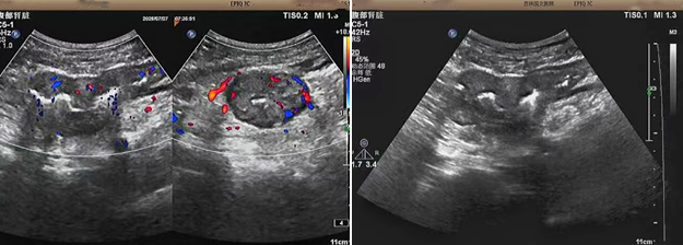 轉(zhuǎn)診至我院后,腸鏡檢查有了重要發(fā)現(xiàn) —— 王女士腸道內(nèi)存在不規(guī)則腫物,腫物表面出現(xiàn)潰爛出血的情況,還導致了腸腔狹窄。這一發(fā)現(xiàn)讓病情的排查有了方向,隨后超聲科接診,立即啟動重點探查,力求更精準地了解病變情況。