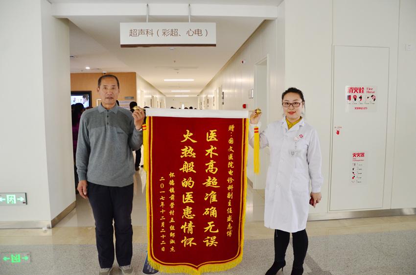 患者加護田文龍說,患者是腎結石疾病,在來我院之前,在鄉(xiāng)下的醫(yī)院做了彩超,沒查出來。來我院盛主任給查出來了,之前就有多次彩超是盛志博主任給做的,非常好。之前還不太相信盛主任,后來去醫(yī)大又做的,跟盛主任檢查的一樣,盛主任做的檢查,真的很準確。解釋的清楚明白,百問不厭,患者用十六個字概括“醫(yī)術高超,準確無誤,血熱般的醫(yī)患情懷”,患者打算給盛主任做一面錦旗。