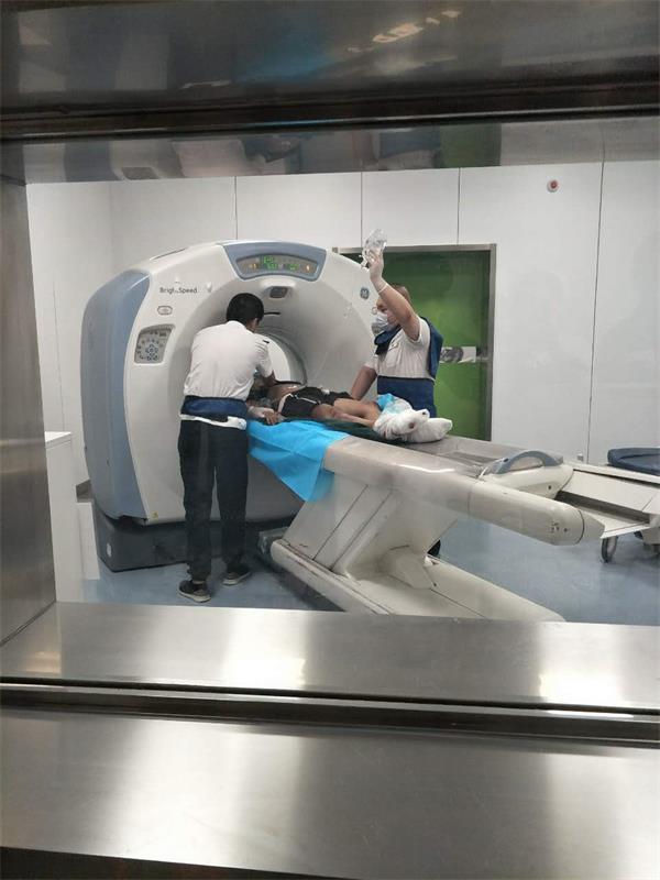 不遠處可見120秦屯分站救護車正急速駛向我科,當患者被抬下車查看患者意識模糊,躁動;而后迅速將患者安全安置在平車上緊接著將患者送往急診搶救室,我們科外科王明偉醫(yī)生也對患者全面查體,發(fā)現(xiàn)患者雙下肢都有明顯開放傷口,立即對傷口進行加壓包扎,這時秦屯分站的救護車醫(yī)生也做了交接工作,患者是車禍外傷,到達現(xiàn)場時有兩名患者,一位當場死亡,另一位則被送到我院,患者四肢頭面部均有開放傷,由于患者處于意識模糊狀態(tài),查體不配合也成為了較困難的干擾因素,外科醫(yī)生及時下達醫(yī)囑建立靜脈通路,由于患者的失血量可能過多,導致血管不充營,對護士進行留置針穿刺術也考驗的一定的專業(yè)素質(zhì),而我科搶救室護士迅速執(zhí)行完醫(yī)囑,并跟隨我科出診醫(yī)生去做相關的檢查。檢查也有了難題,由于患者處于意外事故,并沒有家屬陪同,關鍵患者是躁動加上意識不清,對于CT檢查也是嚴重的不配合,為了讓及時的檢查順利進行,我科兩名出診醫(yī)生,田益竹、姜超穿上了鉛衣,負責固定注患者的體位,和液體的及時補充,檢查出骨盆粉碎性骨折,CT值班人員也幫助迅速出片,在電話與外科醫(yī)生做了溝通后,我科醫(yī)護迅速將患者送往ICU,完成了一次順利的綠色通道。