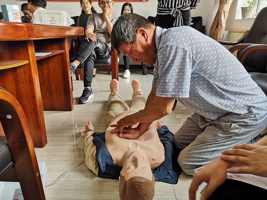 隨后,李堯醫(yī)生通過通俗易懂的語言對心肺復(fù)蘇術(shù)操作中各項步驟進(jìn)行有序講解,對其中的重點、難點進(jìn)行著重講述?;顒又饕詫嵺`操作的方式展開,向在場的社區(qū)居民講解如何調(diào)整體位、打開氣道、判斷呼吸、人工呼吸、胸外心臟按壓等內(nèi)容。